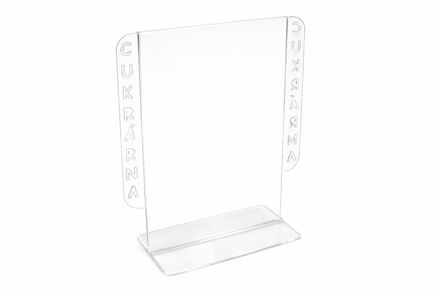 Obrys plexi stojánku i písmo řežeme LASEREM (čiré hrany). Je vhodný na velikost vkládaného papíru formátu A5 ( 210x150mm) s orientací na výšku.